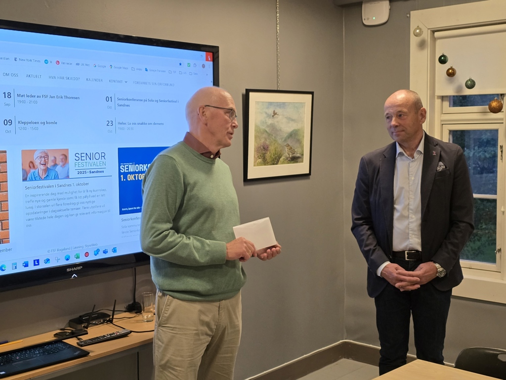 Foto over Marie Gjelsvik: Leder Forsvarets Seniorforbund Jan Erik Thoresen og Terje Gjelsvik leder FSF Rogaland